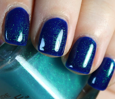 Revlon Royal is a gorgeous deep royal blue jelly in Revlon's Top Dry line. The formula of this polish was thick but relatively easy to work with. If this polish was any thinner, it would have been flood city and as pigmented as this polish is, it would have been a nightmare to do cuticle clean up. I usually prefer my polishes a bit thinner but I was grateful that Royal was as thick as it was. After 2 coats of Royal, I did one coat of Pure Ice Heartbreaker on top, a gorgeous green shimmer. I believe Heartbreaker is still available but last time I saw, the formula had changed and it wasn't nearly as shimmery as it was before and had a milky base. I'm glad to still have a bottle of the original version.